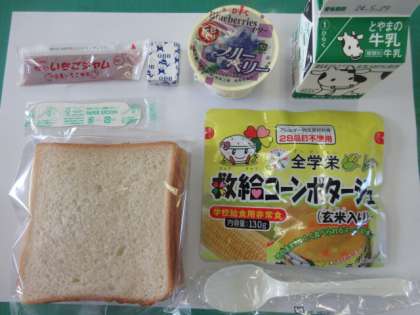 今日のメニューは、献立の食パン、牛乳、ポケットチーズのほかに、いちごジャム、救給コーンスープ、ブルーベリーゼリーが付きました。