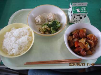 今日のメニューは、ごはん、牛乳、えび包子、華風和え、酢豚でした。包子に華風和え、酢豚と日本人好みの中華料理メニューが並びました。どれもおいしくいただきました。