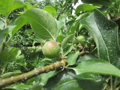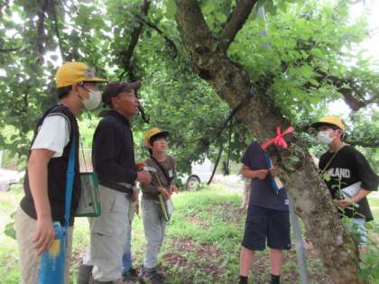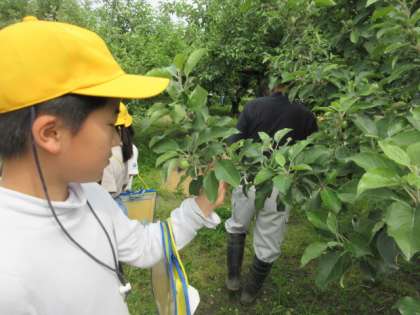 家の手伝いで、実際にりんごの摘果を体験している子供もいました。