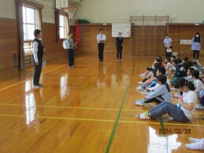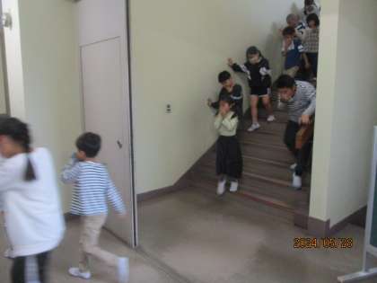 避難訓練を行いました。階段を降りる際には壁を手で触ったり体勢を低くしたりする姿が見られました。「自分の命は自分で守る」ためにはどんな行動が必要か、自分で考える力を訓練を通して身に付けていきましょう。