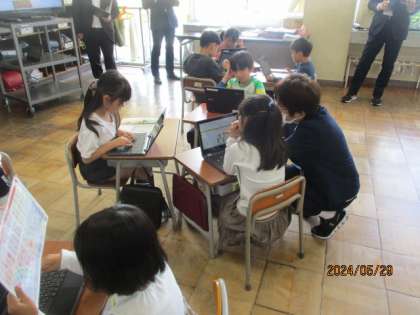 2年生は友達が作った問題を解き合い、3年生は筆算の仕方を話し合ってまとめました。クロムブックを活用しながら自分たちで学習を進めていました。