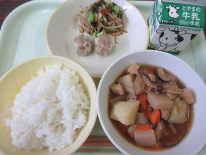今日のメニューは、ごはん、牛乳、肉シューマイ、香味和え、筑前だきです。