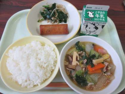 今日のメニューは、ごはん、牛乳、春巻き、塩ナムル、八宝菜です。