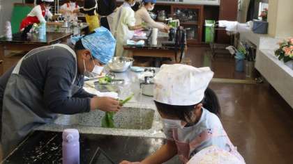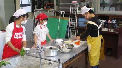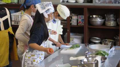 自分たちで立てた計画表を見ながら、野菜サラダを作っています。おいしくできるかな。
