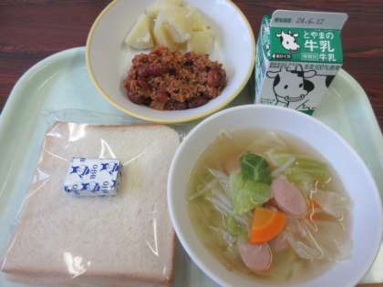 今日のメニューは、食パン、牛乳、チリコンカン、こふきいも、キャベツスープ、ポケットチーズです。