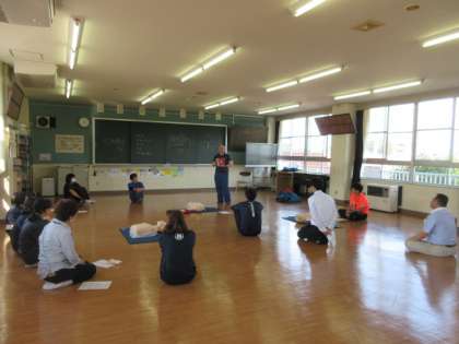 放課後、呉羽消防署から署員の方にお越しいただき、救命救急講習会を行いました。