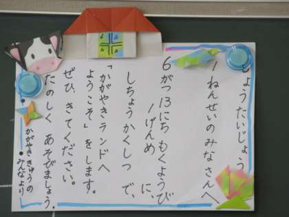1年生教室に、「かがやきランドへようこそ」という招待状が貼ってありました。