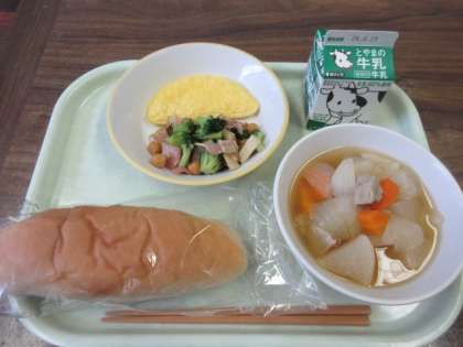 今日のメニューは、コッペパン、牛乳、チーズオムレツ、きのこと豆のアヒージョ、ポトフです。