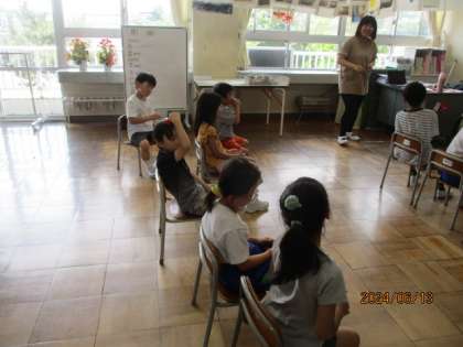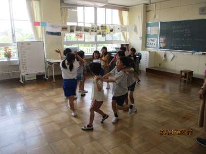 2学年合同で楽しく音楽の学習を進めています。白くまのジェンカでリズムに乗って体を動かしたり、カスタネットを使って言葉のもつリズムを確かめたりしていました。