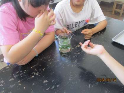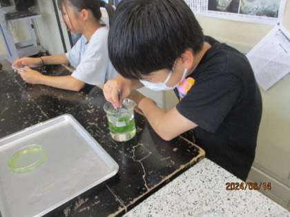 光合成によってでんぷんが作られているのか調べていました。写真は熱湯で温めたエタノールに葉っぱをひたして色を抜いているところです。なかなか難しい作業のようです。