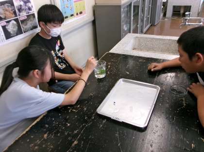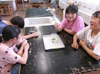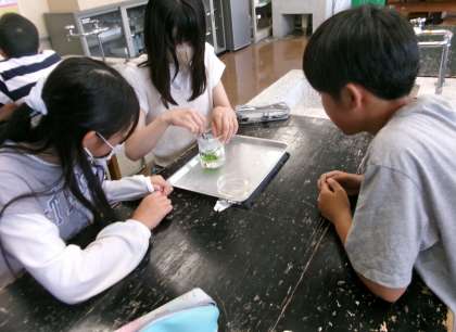 それぞれ畑で取った葉の様子を、実験しています。これから結果をまとめていきます。
