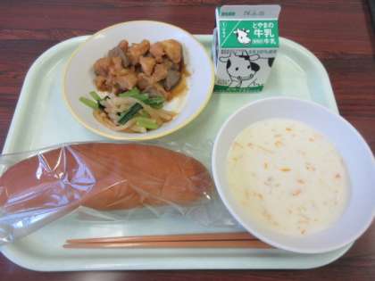 今日のメニューは、米粉コッペパン、牛乳、鶏肉とレバーのりんごソースからめ、大根サラダ、ビーンズポタージュです。