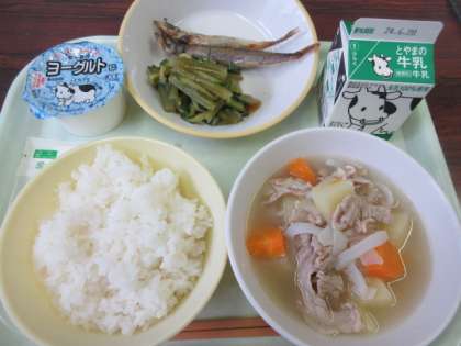 今日のメニューは、ごはん、牛乳、ししゃもの米粉揚げ、茎わかめの中華和え、塩肉じゃが、ヨーグルトです。