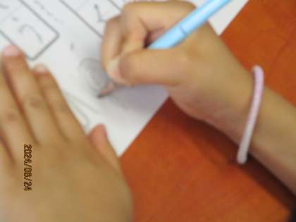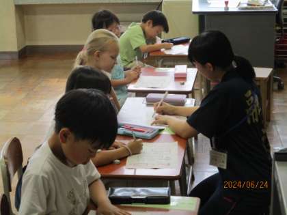 今日から仲間が増えて5人になった1年生です。「おれ」「まがり」などを意識してていねいに字を書きました。早く終わった人は先生にうすいペンで模様をかいてもらい、それをなぞることにチャレンジしていました。「え〜難しい〜」と言いながらも、楽しそうに取り組んでいる様子がよいと思いました。
