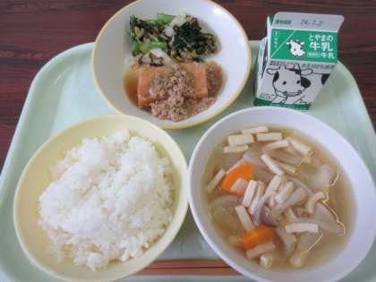 今日のメニューは、ごはん、牛乳、揚げ出し豆腐の肉みそかけ、磯和え、みそ汁です。