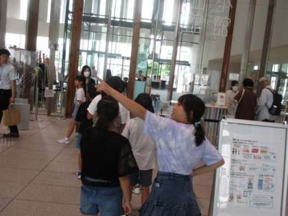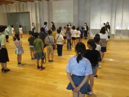 ガラス美術館に到着しました。寒江小、四方小の皆さんと一緒に、館内見学のための説明を聞いています。
