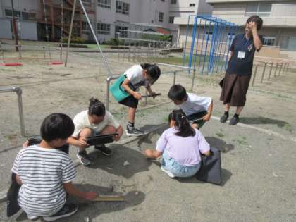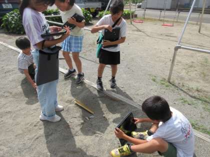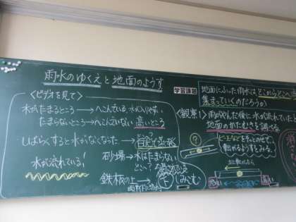 地面に降った雨水が、どこからどこに集まるのか、グラウンドでビー玉を転がしながら傾斜を調べていました。