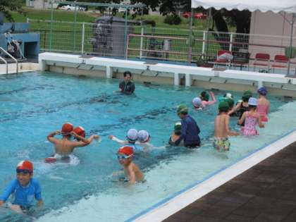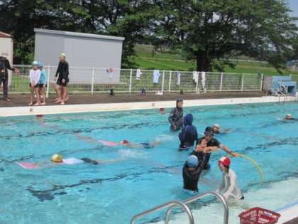 下学年は慣れるまで、プールの中を回り、流れるプールをつくっていました。