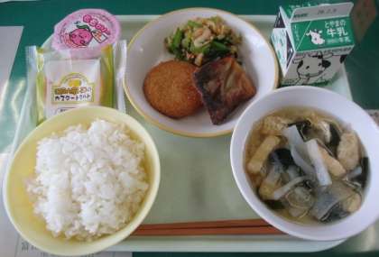 今日は選択献立の日です。メニューは牛乳、ごはん、いり大豆和え、具だくさん汁。