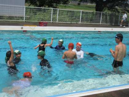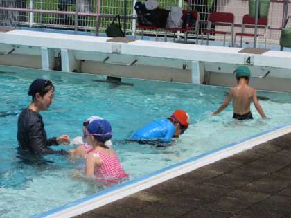 顔を水に付けたり、水中でじゃんけんをしたりしながら、水に慣れる練習をしていました。