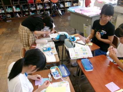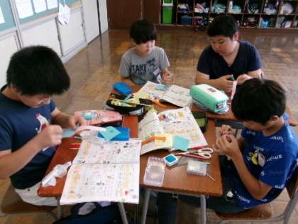 家庭科で、ミニバッグを作っています。フェルトを切って、ボタンを付けたり、糸で縫ったり、友達と協力しながら取り組んでいます。できあがりが楽しみです。