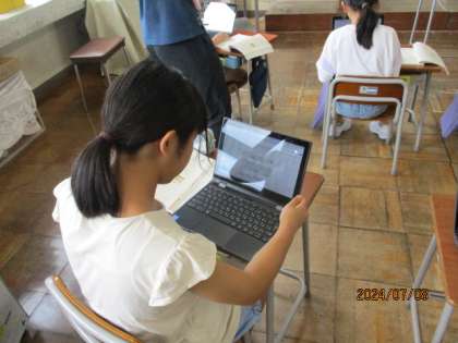 報告する文章を仕上げていました。クロムブックで文を打ち込むと、加除修正がしやすい上に、順序も変えられるので、文章構成を考える活動では力強い味方です。