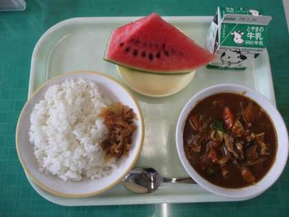 今日のメニューは、ごはん、牛乳、夏野菜カレー、福神漬け、すいかです。夏野菜カレーには、なす、かぼちゃ、トマト、ピーマンが入っていて、夏バテを防ぐ栄養がたっぷりです。おいしく食べて元気に活動しましょう。