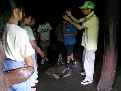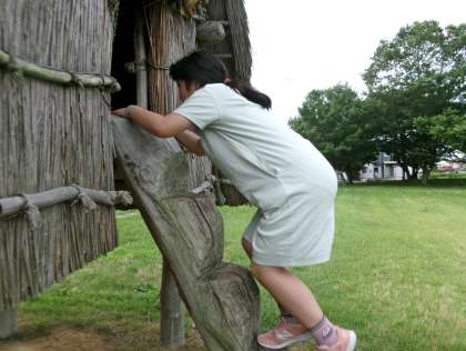 北代縄文広場では、縄文時代に実際にあった建物であるたて穴式住居や高床式倉庫に入ってみました。