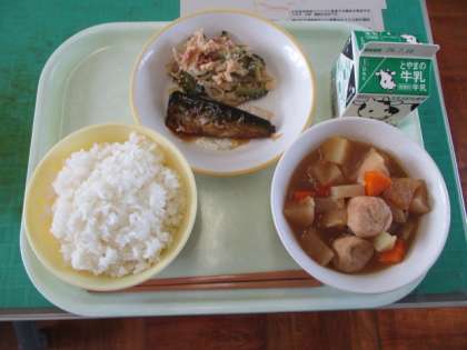 今日のメニューは、ごはん、牛乳、いわしの梅煮、ベーコンとゴーヤの卵炒め、炊き合わせです。夏野菜のゴーヤは「にがうり」とも呼ばれます。苦みが苦手な人が食べやすいように調理の仕方を工夫されています。おいしくいただきましょう。