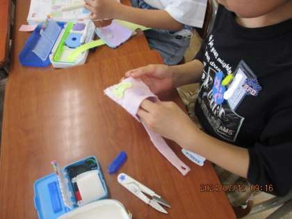 これまでに教わった玉結びや玉どめ、波縫い等を使って、ミニマイバッグを制作していました。慣れてきたのか、よりきれいに、丁寧に縫おうという意識が出てきたようです。