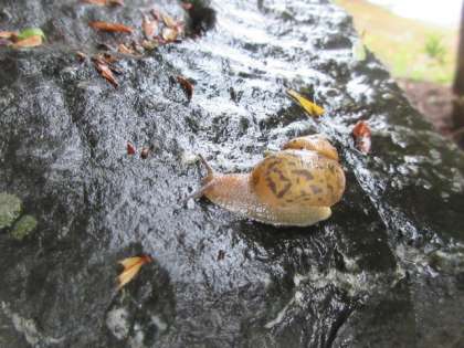 かたつむりが、玄関前の石の上をゆっくりと移動していました。