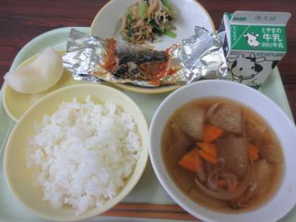 今日の献立は、ごはん、牛乳、さばの銀紙焼き、はりはり和え、冬瓜スープ、梨です。