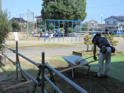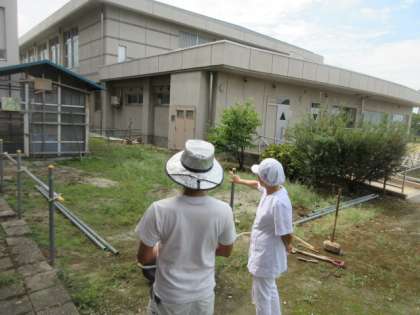 用務員さんが、柵作りを進めてくださっています。