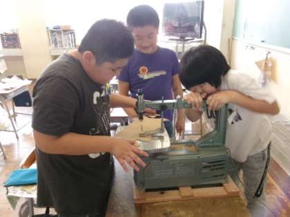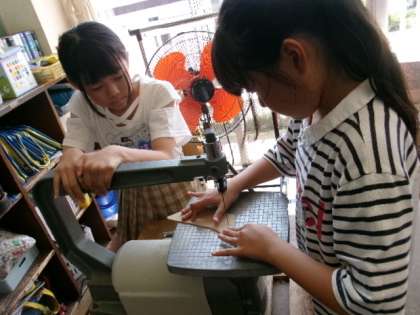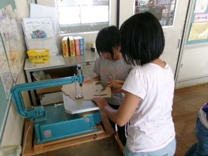図画工作科では、「糸のこすいすい」の学習をしています。電動糸のこぎりを使って板を切りました。友達と協力しながら、木の板を上手に切っていました。
