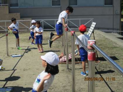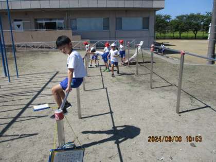 鉄棒遊びをしています。いろいろな技に挑戦しています。動画を参考にポイントを意識して取り組む子、友達にアドバイスする子、どんどん難しい技に挑戦する子など、それぞれが楽しく鉄棒運動に取り組んでいます。