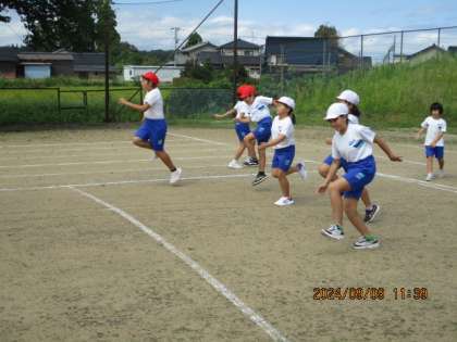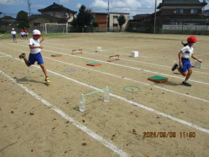 ハードル走を行いました。ウォーミングアップ後、様々なコースで自分の走りやすいリズムを見つける練習をしました。友達に歩数を数えてもらったり、何歩がリズムよく走れるかを相談したりして練習を重ねていました。