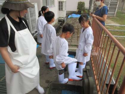 手指だけではなく、長靴も消毒します。