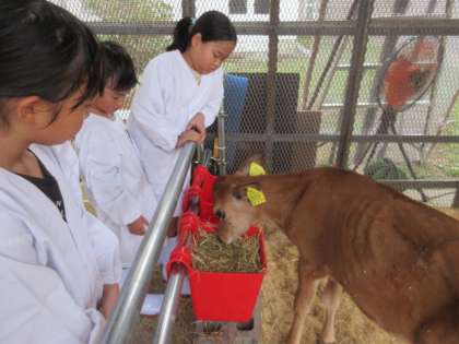 しっかりと着替えて、牛さんを大切にお世話しています。