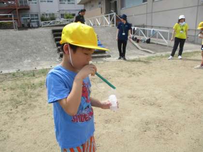 様々な道具を使って、小さなしゃぼん玉から大きなしゃぼん玉まで作りました。