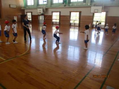 声をかけ合い、タイミングをはかりながら長縄を跳ぶ練習をしています。