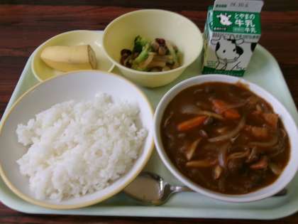 今日の献立は、ごはん、牛乳、たべきりんハヤシ、ビーンズサラダ、バナナです。