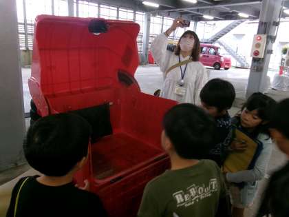 子供たちは、バイクのかごを見せてもらったり、バイクにまたがらせてもらったりしながら、配達業務に触れていました。