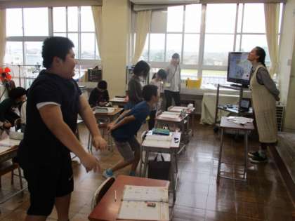 道案内に必要な表現に慣れ親しんでいました。ゲームでは、動作を用いて言葉が表す意味を楽しく学んでいましたね。