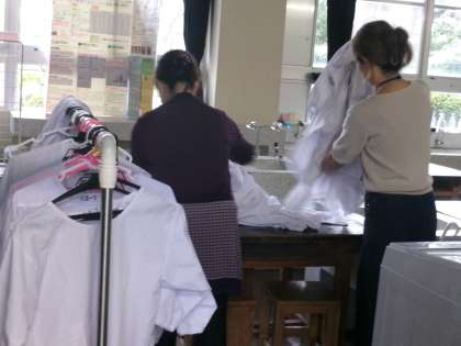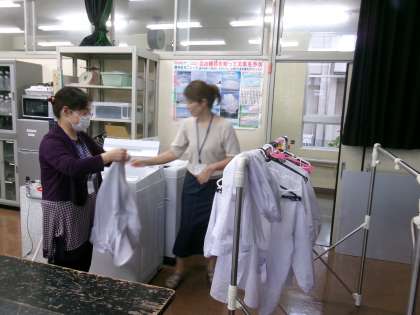 毎週金曜日、事務員さんと、助手さんが、牛小屋に入るときに子供たちが着る白衣をすべて洗ってくださっています。
