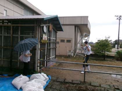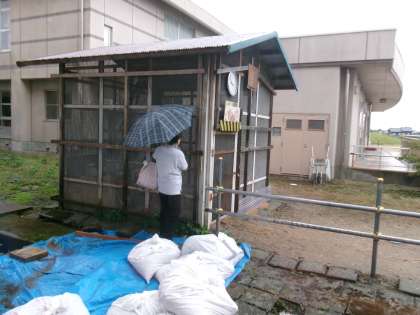 教頭先生が、小屋の時計を直しています。