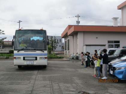 1、2年生がバスに乗り込む3〜6年生を笑顔で見送りました。けがなく思い出に残る楽しい食泊学習にしましょう。