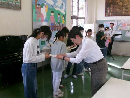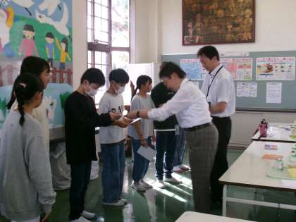 チャレンジ陸上記録会の記録証を、6年生一人一人に手渡しました。