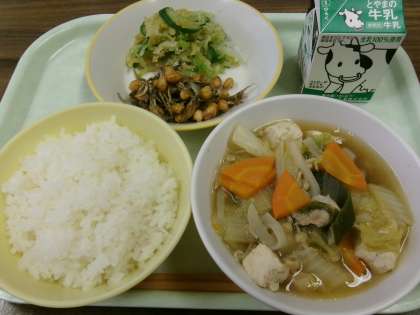 今日の献立は、ごはん、牛乳、小魚入りフライビーンズ、あわせ和え、はくさいなべです。