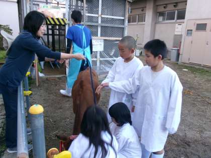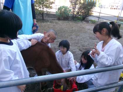 短い休み時間でも、ななこの様子が気になる子供たちが、牛小屋に集まってきます。