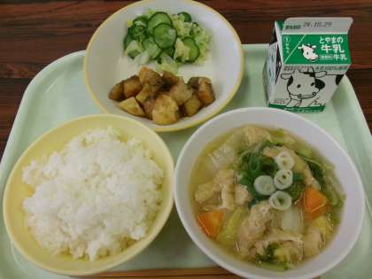 今日の献立は、ごはん、牛乳、魚とじゃがいもの揚げ煮、きざみ和え、みそ汁です。